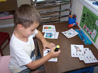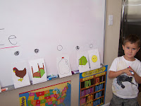 Here are some pictures from todays work, here he is working his Hot Dot cards, he likes these, I do make him do the correct answer, after which he’s allowed to dot his little heart away. He just likes the sounds and lights it makes. Also pictured is a vowel sounds game, I’m not sure why but he really likes to fill in the dots on the white board. I say a word like ‘bed’ and he colors the dot above the corresponding card if he hears an ‘E’ sound.