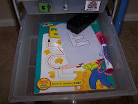 Also, practice writing letter E on Kumon wipe off alphabet cards and Maze Book. I think I got them both at Borders. Really this box is just for fun because his sister did it yesterday, but he LOVES the dry erase maze book and its still good handwriting practice!