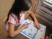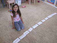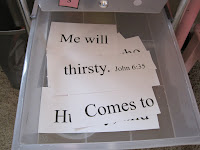 8. Verse Puzzle, I got the idea from Ginger’s Blog, love her ideas! I printed her memory verse on cardstock in large font, and cut it into pieces. The verse is on the white board and she had to put it in the correct order. We’ll do the ribbon and hang it thing later this week once she gets the verse down. Thanks Ginger, this was a big hit!