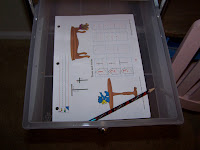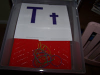 Introduce letter Tt, though he already knows this. I also put in a geoboard for him to make some T’s and t’s for me. We’ll also play a game with the letter T and he’ll start his blends tomorrow. He’ll also practice the Tt on the whiteboard before moving onto the worksheet in box 3.