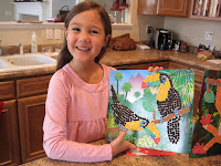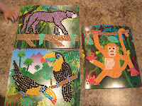Sticky Mosaics. I have to say that I doubted my 3 year old could handle this assignment, too short of an attention span, but really she did quite well. Below is a close up of the sheet my son is working on, you can see the numbers in little squares, its a good activity that enforces number recognition, number/color association and one to one correspondence! Not to mention patience and perseverance!