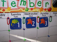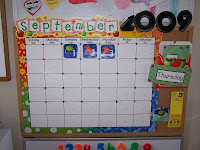 Here’s a closeup of our calendar. I put it on a cork board and put push pins on each day. I usually have them do some sort of pattern using the colored links. Then each day they have to count the calendar. I find this works wonders in teaching number recognition. Right now it’s my kindergartner’s job to teach my tot. He gets practice without realizing it, and she learns what her numbers look like! 2 for 1!