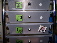 Here’s a closeup of one of our ‘workstations’. The drawers are Smart Space 10 drawer rolling carts from JoAnn’s. I also found some colored ones online at ebay, and several people have said they found them at Sam’s Club as well. Unfortunately they are double what I paid as they were 50% off at JoAnns when I got them.