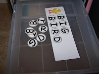 bIg bIrd bottlecap letter match game. I download it from here. I also made up my own sheets after downloading the letter templates from Shannon’s site.