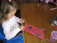 Our canoe making, I cut and punched holes in the construction paper, then the kids decorated and laced the canoes. They are currently playing with them with our counting bears as passengers…the 3 year old wants to know where her wigwam and tepees are…um, hmmm…where did I put those?…(Ok, fine, I secretly tossed them after a couple weeks of being on my counter un-played with! LOL!)