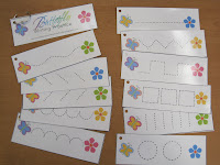 Butterfly pre-writing practice: I laminated these then cut them out along the lines, hole punched the corner and used an o-ring to bind them together like a little booklet. Use dry-erase markers to practice writing numbers. I un-binded them so you can see what each card looks like. ( You can also print these on regular copy paper and use for cutting practice!)