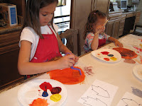 Afterwards we painted leaves and cut them out and glued everthing onto black construction paper. Then we tried to paint on the swirly vines etc. Here is our finished product, little like flying pumpkins LOL!
