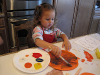 We tried the autumn collage from Deep Space Sparkle today to finish up our Letter P week. Ours don’t look quite as cool as hers, but they were still fun none the less. I like the painting on black paper, it turns out cool. Here we are painting our pumpkins: