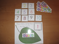 Counting Caterpillars, Put the number cards in the box, then have them count that many caterpillars to place on the leaf.