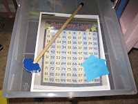 6. Counting box, everyone has a pointer stick for counting! The card is just a picture of our number poster so he knows to go to it and count, the sticky note tells him how high to go.