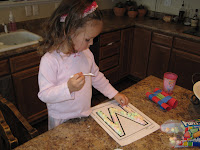 Since we’re finishing up Letter M today, we had to do a marshmallow craft! We printed large M’s from Christine Clemente Stack’s Letter of the Week! and glued marshmallows on them, and ate some too…ugh…this was a sugary week! We used colored marshmallows too, more fun!