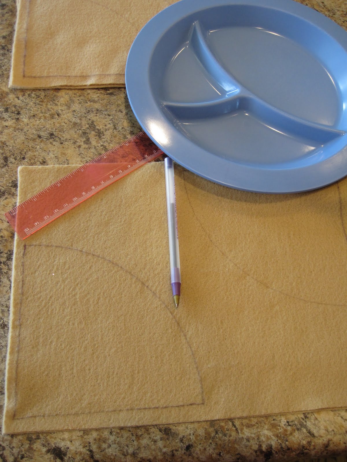 1. Using the light tan felt, trace your pizza pie shape onto the felt. The straight sides measure 5.5″ and then I used a plate to draw on the curve. (Repeat 4 times if you’re making a whole pizza)