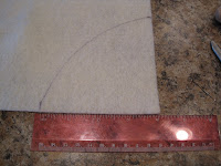 4. Using cream felt for cheese, trace pie shape onto it. The edges of the cheese will be 4″ on both straight edges, and again I used the plate to trace on the curve. Repeat for 4 slices of cheese and cut out. (I just traced one, then folded the felt in half and cut it all at the same time.)