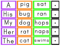 Its great practice for beginning readers! Basically, they can mix up the words any way they choose as long as they put it on the color strip in the correct color order: purple goes first, then orange, then pink, then finish with a black period card.
