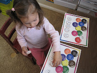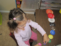 M&M; Letter Matching! Click here to learn how to make the letter disks. If you’re looking for more challenge, use the uppercase card with the lowercase letter disks or visa versa! Click here to download the m&m; cards and letters!
