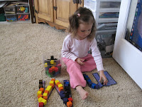 Our Large Letter building fun! I am using my large alphabet lacing cards with our color cubes. She’s supposed to alternate color cubes to make a pattern, but said she ran out! Its all good in prek! Click here to download my Large A-Z Letter Lacing Cards