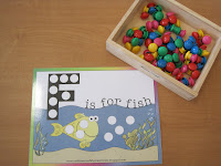 Fish Counting: Practice counting the fish and then put the correct number in the blank square. (Note: To save on paper, you could just print the numbers from one game and use them on all the other alphabet counting games!) This time I made it into a little booklet, and put velcro dots on the pages and numbers, so she can stick the correct number on to the page then flip it and do the next one.