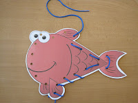 Fish Lacing Card: I make sure to laminate this one for durability, then punch with a hole punch every inch or so for lacing practice. Teach them patterns to do with this as well, like up from the bottom each time, or in-out-in-out…I did both in this picture to illustrate: