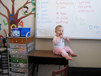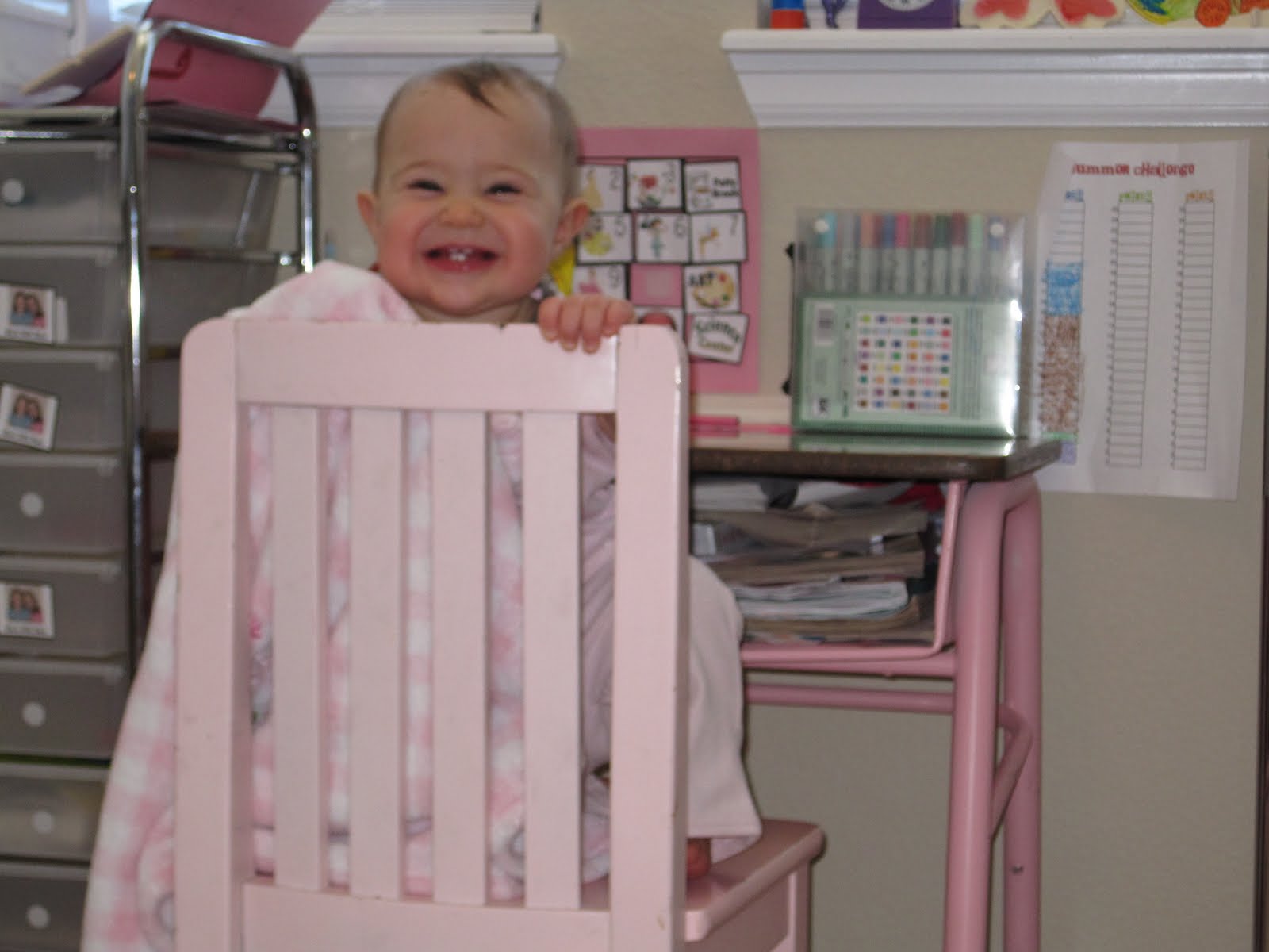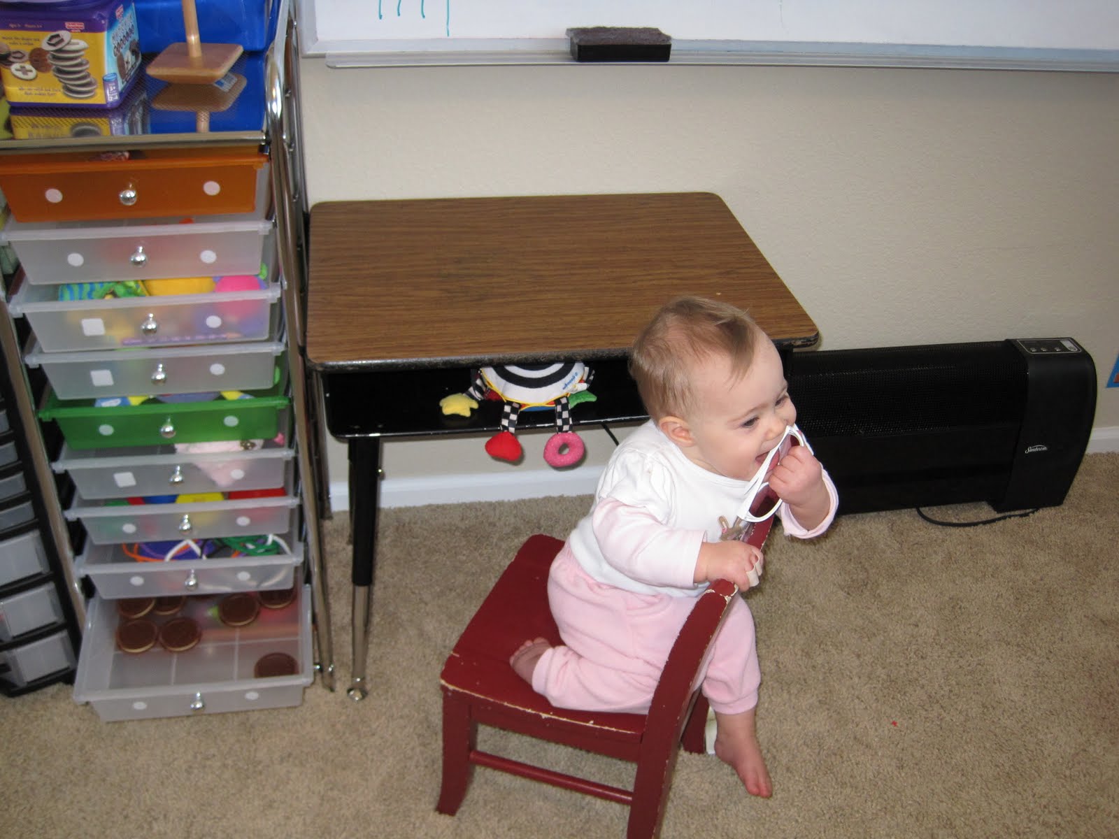 This is a post just to let you all know that I’ve officially given up! The Teeny Tiny Tot has won. After weeks of trying to keep her off desks and off chairs and out of everyone’s boxes, I’ve given up. Here’s a glimpse at what our school’s been like lately…imagine trying to do work with this on your desk: