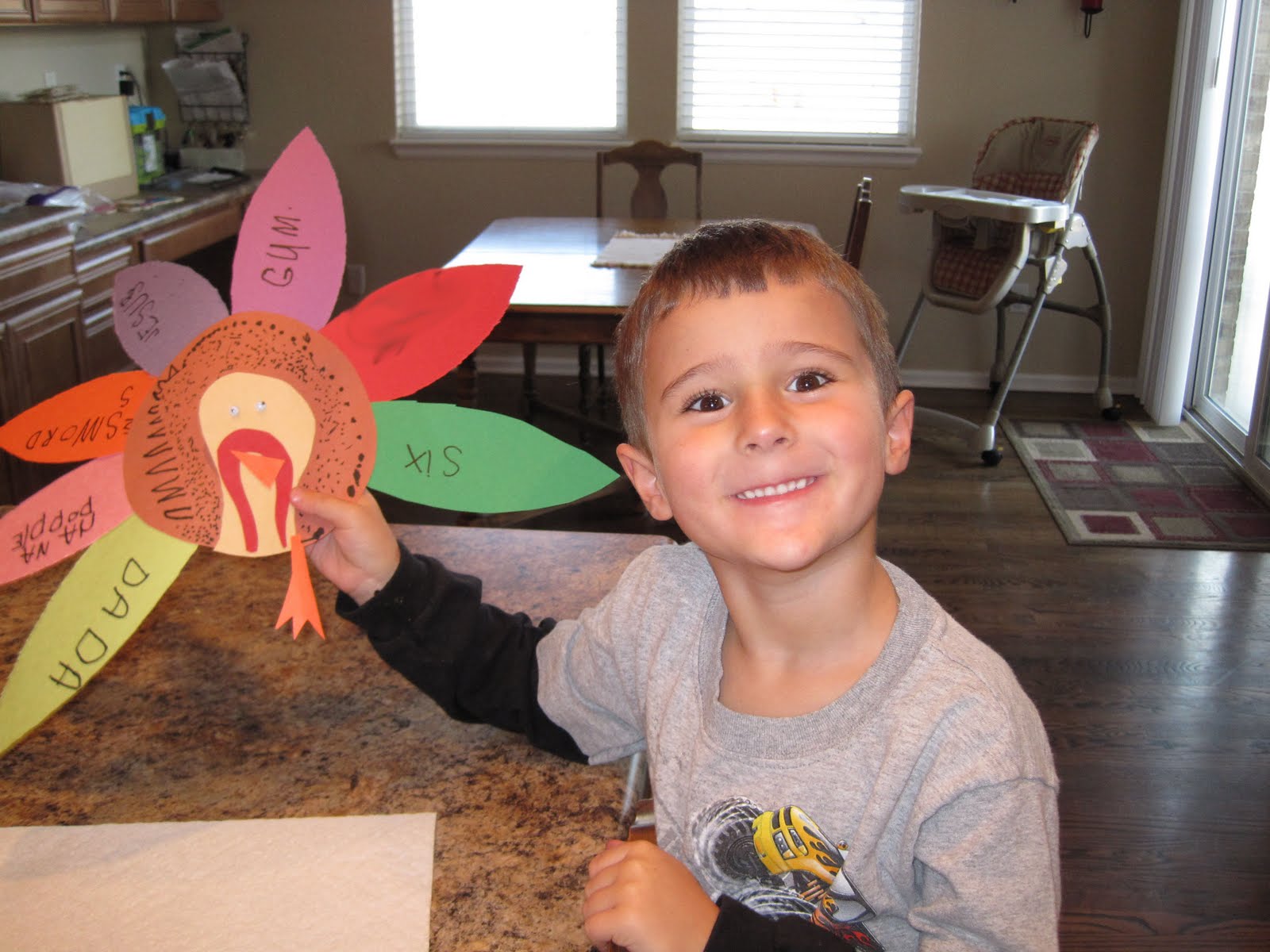 We used my felt turkey template and instead of using felt, we cut everything out of construction paper to make our own Thankful Turkey Craft! After gluing on the basic turkey body and head etc. we wrote something we were thankful for on each feather then glued them on the turkey.