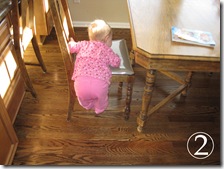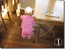 My Teeny Tiny Tot has embarked a new mission called “The Kitchen Table”. She’s discovered that with some effort, she can get to all the goodies that were previously out of her reach…here she is in action: