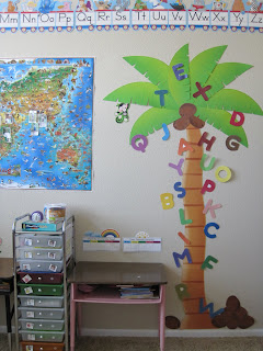 I almost bought the tree, it sure is a cute one! Instead, I opted for brown package wrapping to use as my tree and dark green craft foam for palm tree branches. Coconuts will be some sort of brown paper. Your letters are laminated and ready to go — great idea!!