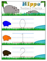 Hippo Number Practice: I laminate then hole punch the upper left corner, and bind with a keyring. Then we use dry-erase to practice writing our numbers.