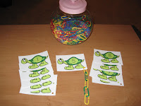 Turtle Clip Cards: I punched a small hole in the corner of the card for her to attach these chain links to, you could also use paperclips, mini-clothespins, etc. The cool thing about the chain links is that you can also have them do patterns while you’re at it! And you know how I feel about 2 for 1’s! Yipee!