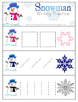 Snowman Pre-writing Skills: I laminate then hole punch the upper left corner, and bind with a keyring. Then we use dry-erase to practice our pre-writing.