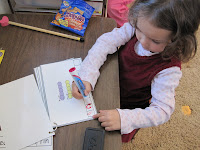 One of her favorite activities, the Caterpillar Graphing Dry Erase pages. She counts the caterpillars then colors or draws circles in the correct amount of squares. She squeals with excitement when she hits 10! You can download the caterpillar graphing game here.